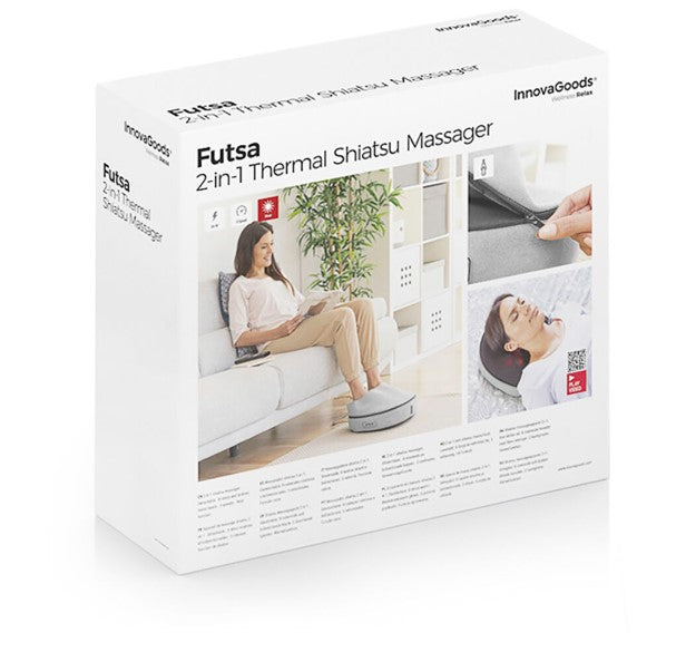InnovaGoods Futsa 2-in-1 Shiatsu Heat Massager on monikäyttöinen hierontalaite, joka yhdistää syvärentouttavan shiatsu-hieronnan ja miellyttävän lämpötoiminnon. Laite sopii erityisesti jalkojen hierontaan, mutta sitä voidaan käyttää myös selälle, niskalle ja muille lihasalueille, mikä tekee siitä kätevän 2-in-1 ‑ratkaisun kotikäyttöön.