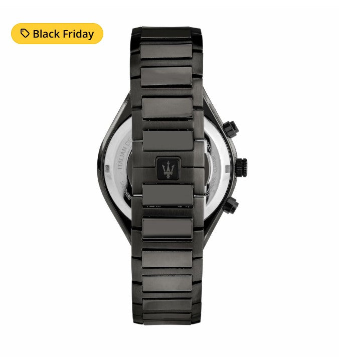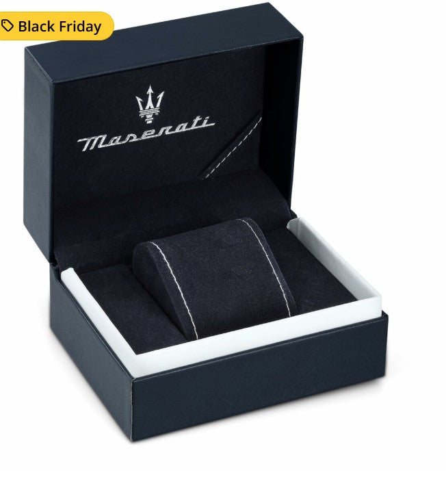 - Kellotaulu: Tyylikäs musta kellotaulu, jossa Maseratin logo ja tarkkaan suunnitellut yksityiskohdat korostavat kellon ylellistä luonnetta.